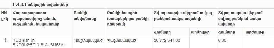 2020 թվականի գույքի, եկամուտների և շահերի տարեկան հայտարարագրում ներկայացված բանկային հաշիվների մնացորդները