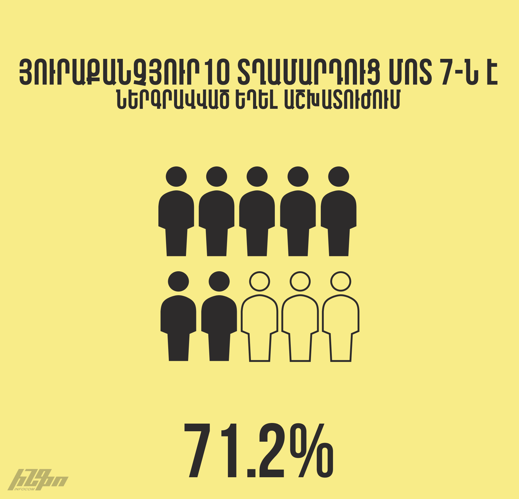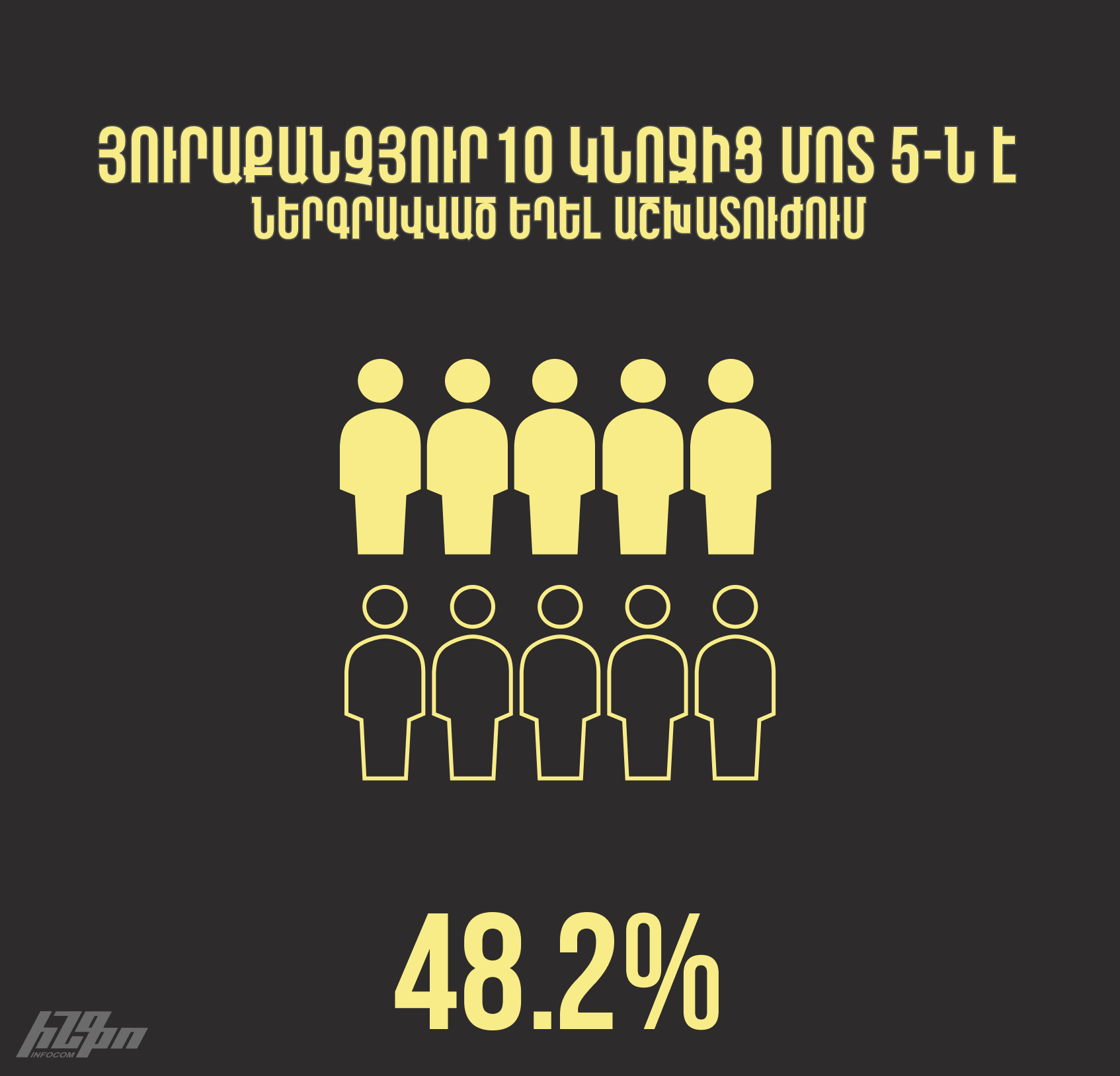 Այսինքն՝ Հայաստանում յուրաքանչյուր 10 կնոջից 5-ը և յուրաքանչյուր 10 տղամարդուց 7-ը ներգրավված է եղել աշխատուժում։