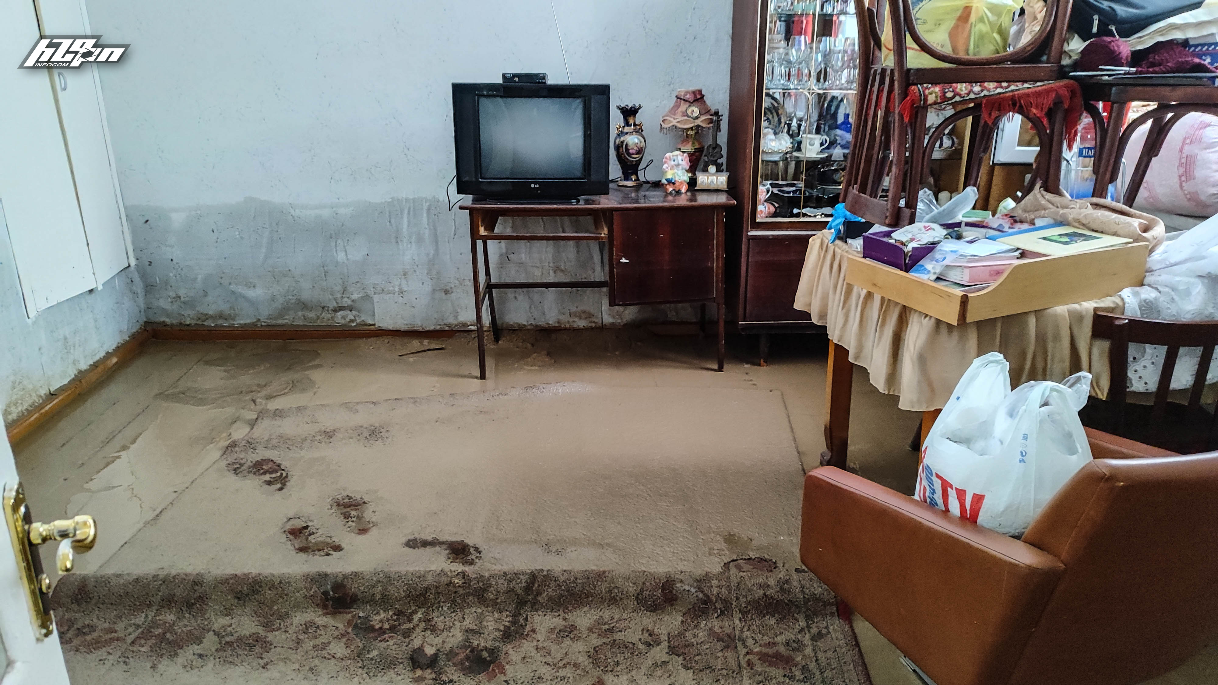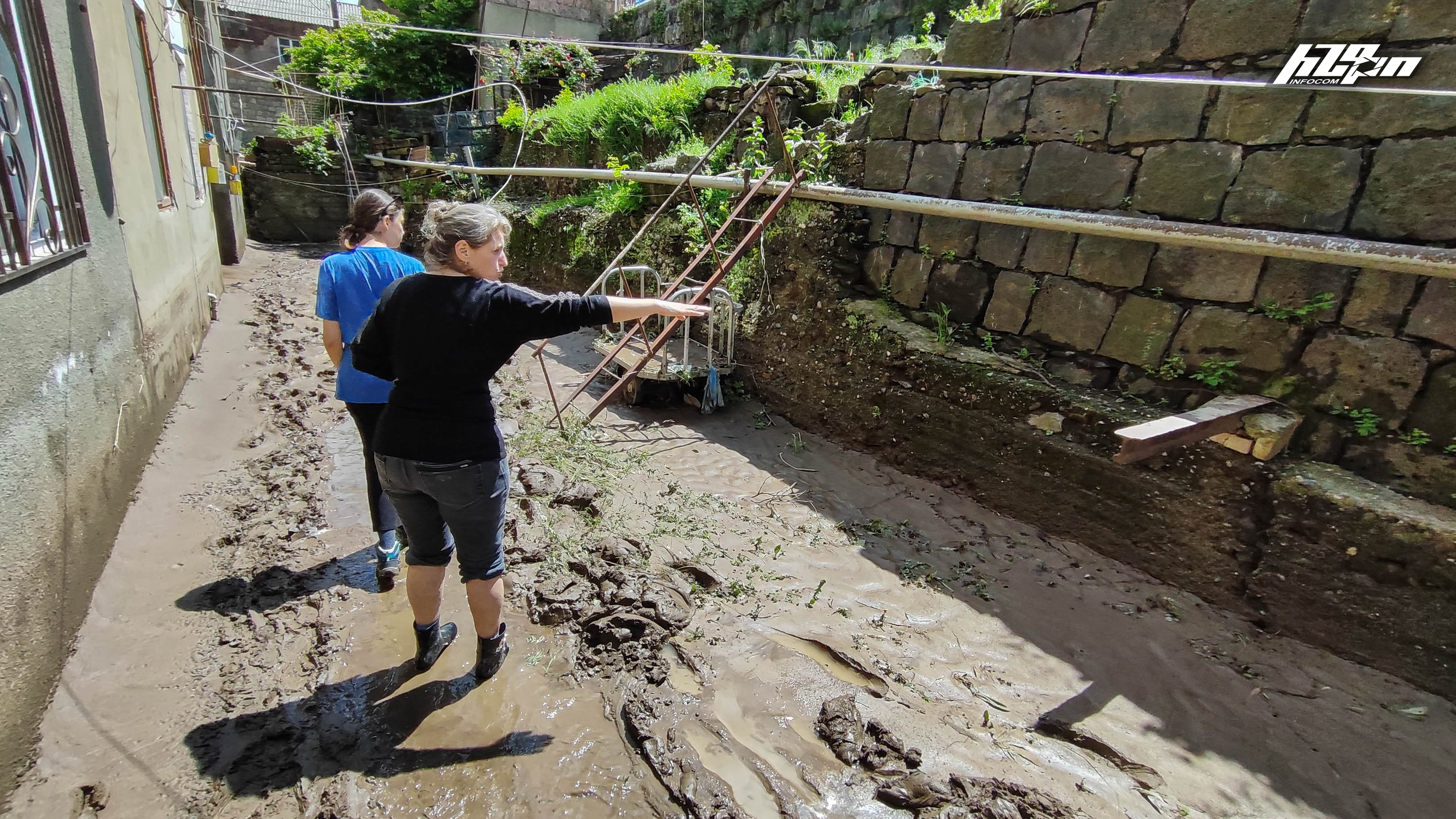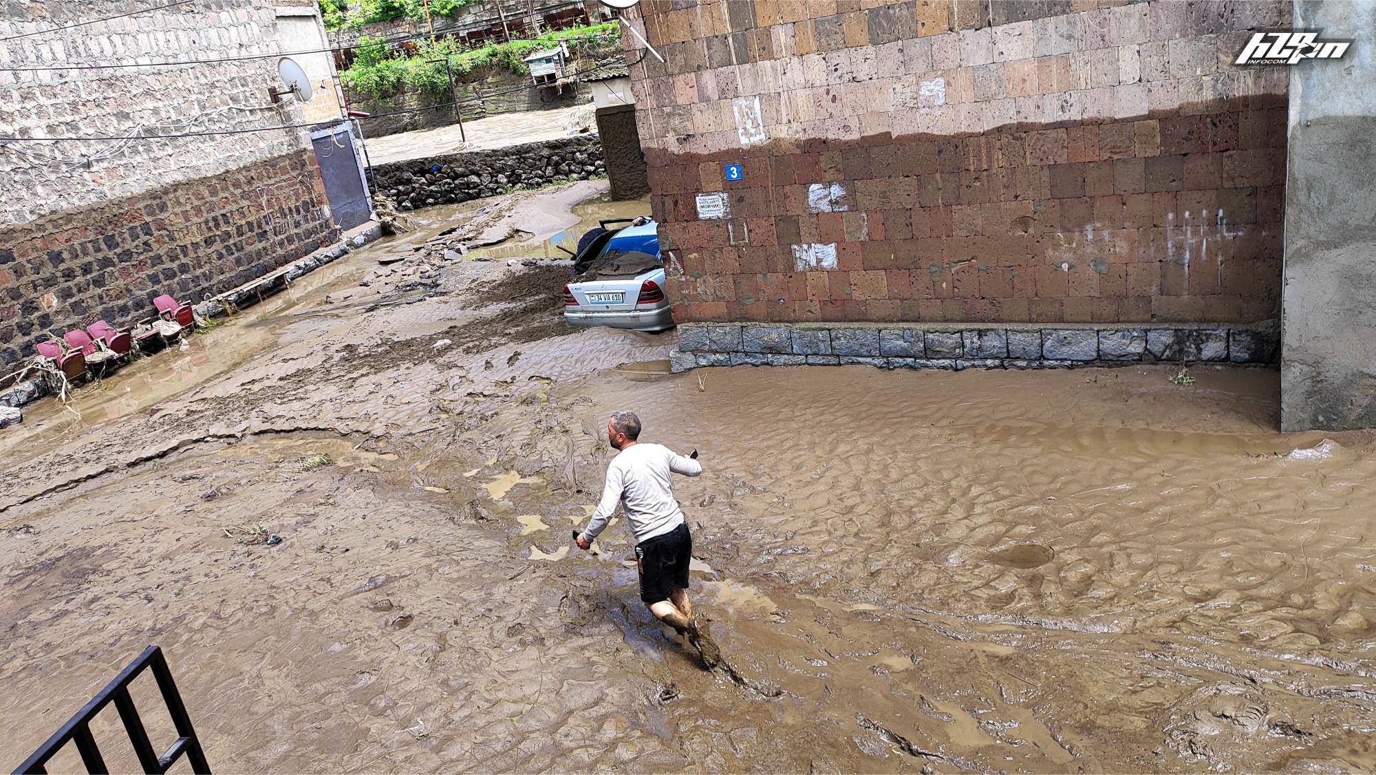 Քիչ այն կողմ՝ թաղամասի շենքերից մեկի բակի ցեխաշերտի մեջ բնակիչները մի ոտաչափ արահետ են բացել, որ ջուրը հոսի՝ դուրս գա։ Շենքերի հիմքը ցածր է, ջուրը միանգամից ներս է լցվել։ «Սոթ չտաք մենակ»,- տուն մտնելիս ասում է Սիրուշ Խաչատրյանը։ Ջուրը, որ լցվել է մուտք, նա ու որդին պատուհանով են կարողացել դուրս գալ, բարձրանալ վերեւի հարկ։ Նրա հարեւանը՝ Էլմիրա Գեւորգյանը, հազիվ է փրկվել վնասվածք ստանալուց․ ջուրը լցվել է տուն ու պոկել նկուղի վրայի տախտակը։ Ջրի բարձրության պատճառով նա չի նկատել անցնքն ու ոտքն ընկել է մեջը։ Բազմոցից բռնվելով է կարողացել սենյակից դուրս գալ․ «Գիշերը 2-րդ-3-րդ հարկերում լուսացրինք, հետո փրկարարներն ասացին, որ գիշերը նորից վարարում կարող ա լինի, խորհուրդ չտվեցին մնալ էստեղ»,- պատմում է նա։