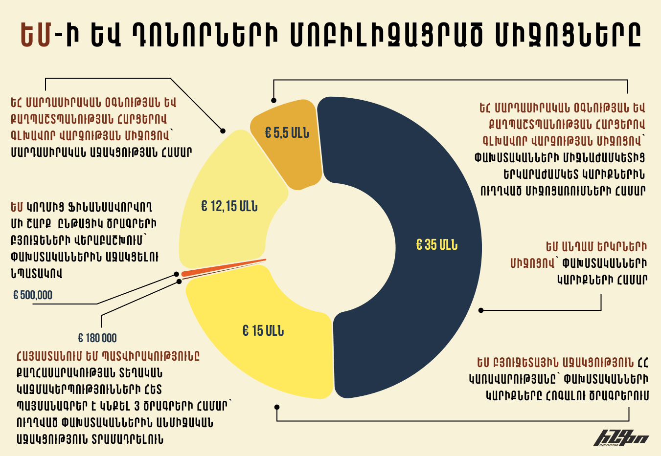 Եվրոպական Միությունից մեզ հայտնել են, որ ԵՄ մոբիլիզացրած ընդհանուր ռեսուրսները (ներառյալ պայմանագրային եւ նախապատրաստման փուլում գտնվող) կազմում են 67 միլիոն եվրո։