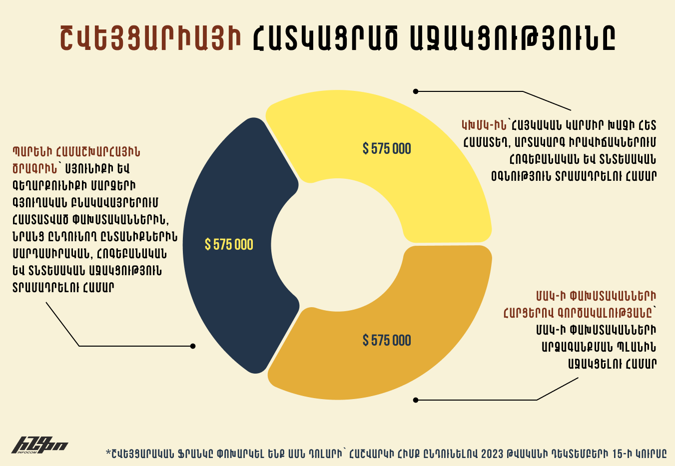 Շվեդիան հատկացրել է մոտ 3 մլն 430 հազար դոլար։ Շվեդիայի օգնությունը եւս բաշխվել է չորս ուղղությամբ։