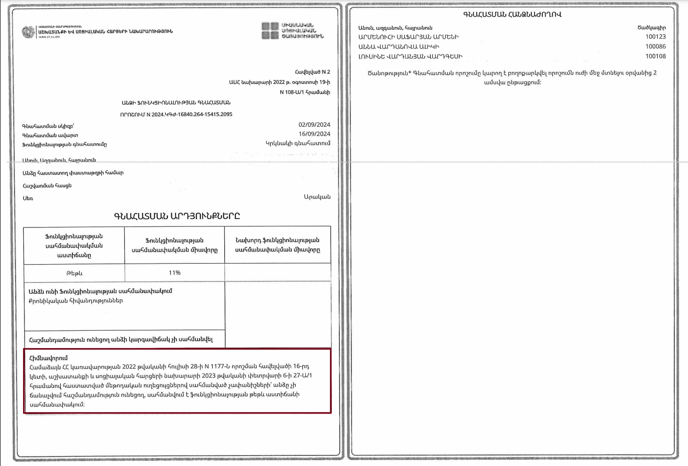 Անձի ֆունկցիոնալության գնահատման որոշման օրինակ