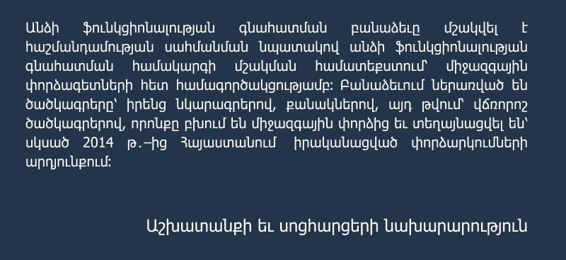2022 թ․ Կառավարությունը սահմանեց անձի ֆունկցիոնալության գնահատման կարգը։ Ըստ դրա՝ քաղաքացին նախ դիմում է պոլիկլինիկա կամ բժշկական որեւէ հաստատություն, որտեղ թերապեւտը կամ բժիշկը նրան ուղարկում է համապատասխան հետազոտությունների, որոնք անհրաժեշտ են ֆունկցիոնալության գնահատման ուղեգրումը կազմակերպելու համար։