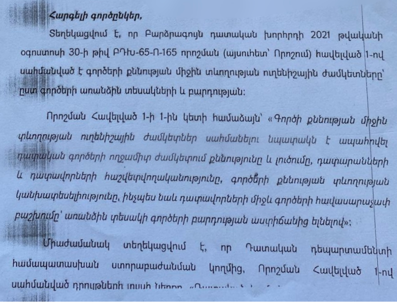 Միակ նպատակը, որ կարող էր արդարացնել այս որոշումը, ըստ Հարությունյանի, գործերի հավասարաչափ բաշխումն ապահովելն է․ «Բայց եթե ընդունենք, որ այդ բարի նպատակն է հետապնդում, ինչպե՞ս է ստացվում, որ օրինակ՝ քրեական դատարանները անհամաչափ են ծանրաբեռնված։ 2021 թ․–ին, երբ որոշումն ընդունվում էր, դատավորները տարեկան կարող էին միջինում 50-60 գործ ստանալ, իսկ այսօր, որքանով գիտեմ, Երեւանի դատավորները ստանում են եւ տարին դեռ չավարտված արդեն իսկ ստացել են մոտ 100 գործ։ Այն, որր նշել են՝ իբր հաշվետվողականություն, ողջամիտ ժամկետ․․․ Իրականում դատավորներին վերահսկելու, հետագայում՝ նաեւ պատասխանատվության ենթարկելու համար է, զուտ այդ նպատակին է ծառայելու ու մինչեւ այս պահն էլ բացառապես այդ նպատակին է ծառայում»,- կարծում է Դավիթ Հարությունյանը։