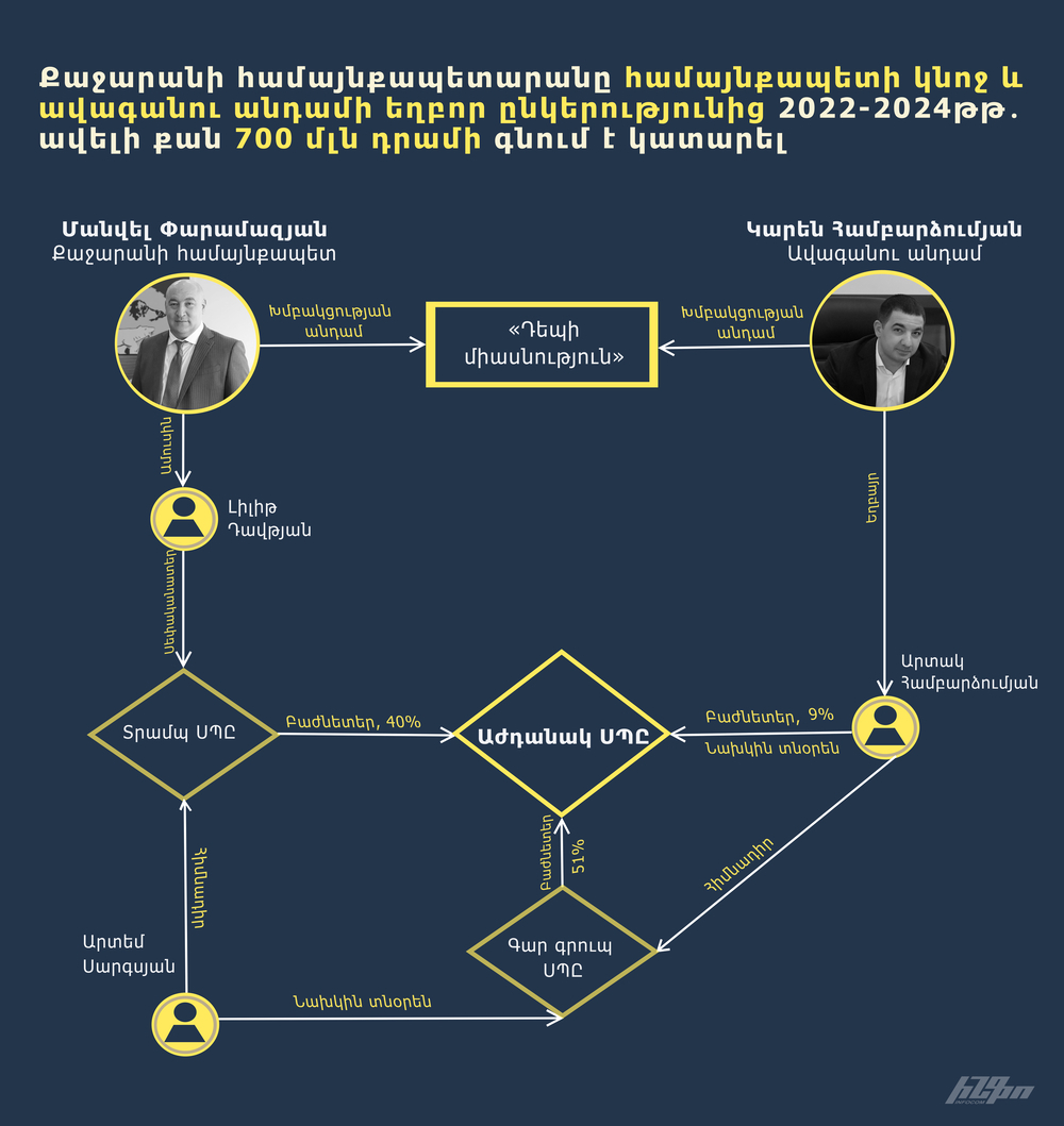 Այսպիսով, Քաջարանի համայնքապետարանը վերջին 3 տարում շուրջ 700 մլն դրամի պայմանագրեր է կնքել մի ընկերության հետ, որի 40%-ը պատկանում է համայնքապետի կնոջը, 9%-ն էլ՝ ավագանու անդամներից մեկի եղբորը։ Միաժամանակ, համայնքապետ Մանվել Փարամազյանը չի հայտարարագրել կնոջ մասնակցությունը առևտրային կազմակերպություններում։