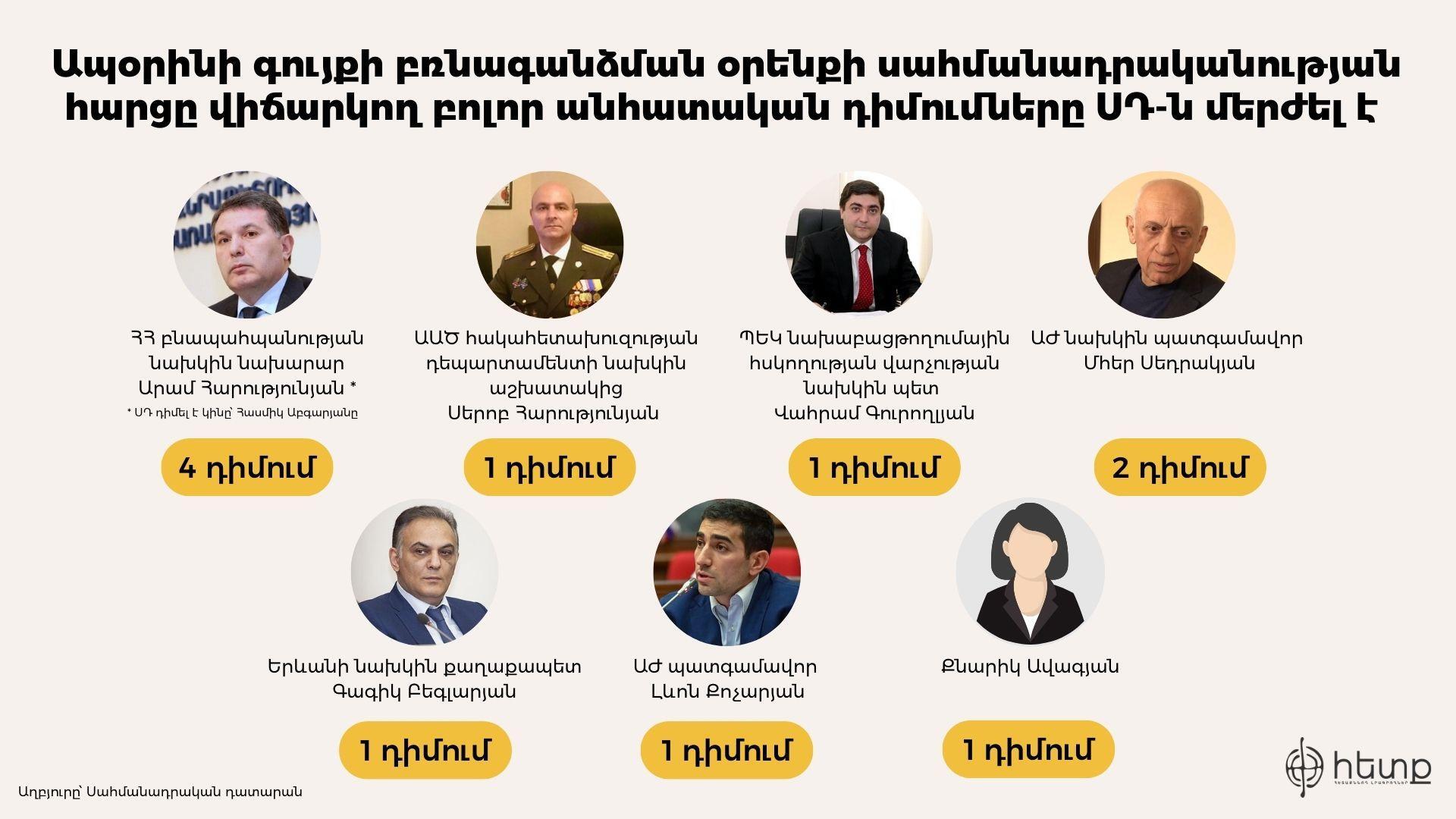 hetq.am: «Ապօրինի ծագում ունեցող գույքի բռնագանձման» մասին օրենքի ուժի մեջ մտնելուց ի վեր՝ 2020թ․ մայիսի 23-ից, Սահմանադրական դատարանը (ՍԴ) օրենքի դրույթների սահմանադրականության վիճարկման պահանջով ստացել է 11 դիմում։ Այդ բոլոր դիմումները ՍԴ-ն մերժել է։ Մերժման հիմքերը տարբեր են՝ դիմումի ներկայացման ժամկետների խախտումներից մինչև ընթացակարգային և բովանդակային այլ խախտումներ։