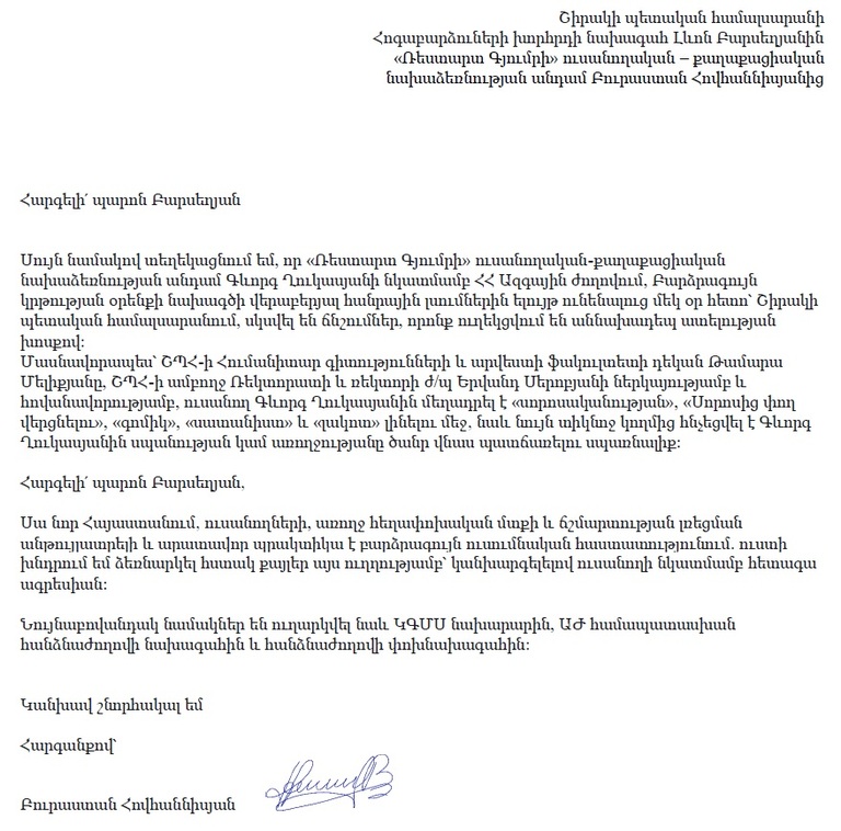 Տեղեկացնենք նաև, որ նամակում նշվում է, որ ՀՀ Ազգային ժողովում Բարձրագույն կրթության օրենքի նախագծի վերաբերյալ լսումների ընթացքում «Ռեստարտ Գյումրի» նախաձեռնության համակարգող Գևորգ Ղուկասյանի ելույթից հետո վերջինիս հանդեպ ՇՊՀ-ում սկսվել են իրականացվել ճնշումներ, որոնք ուղեկցվում են ատելության խոսքով և սպառնալիքներով:
