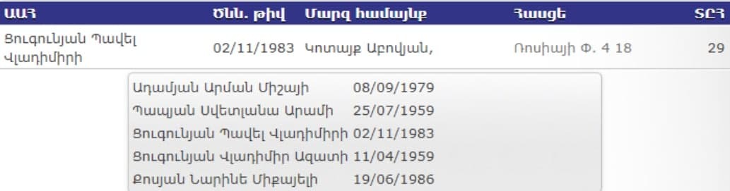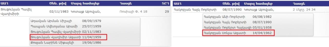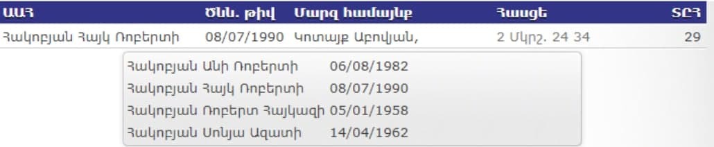 Ընտրողների ռեգիստրում փնտրելով Հայկ Ռոբերտի Հակոբյանին՝ հնարավոր եղավ պարզել, որ նրանց ընտանիքի գրանցման հասցեն Կոտայքի մարզի Աբովյան քաղաքն է: Նույն հասցեում Հայկ Հակոբյանի հետ համատեղ գրանցված է 3 քաղաքացի` Անի Ռոբերտի Հակոբյանը, Ռոբերտ Հայկազի Հակոբյանը եւ Սոնյա Ազատի Հակոբյանը։