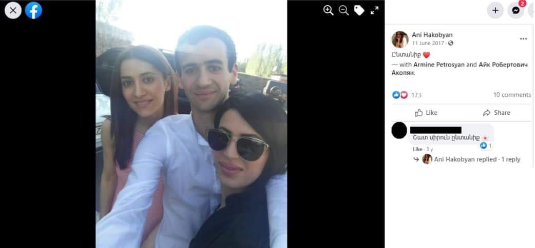 Անի Հակոբյանը ֆեյսբուքում ընկեր է նաեւ Արմինե եւ Ռոմանոս Պետրոսյանների հետ։ Բացի դրանից՝ Հայկ Ռոբերտի Հակոբյանի ֆեյսբուքյան էջում ամիսներ առաջ կային լուսանկարներ, որտեղ Հակոբյան քույր եւ եղբայրն ու Արմինե Պետրոսյանը միասին էին։ Այժմ, սակայն, Հայկ Պետրոսյանի էջից այդ նկարները կամ հեռացված են կամ միայն ընկերների համար են հասանելի։
