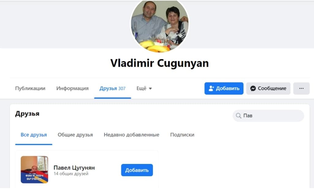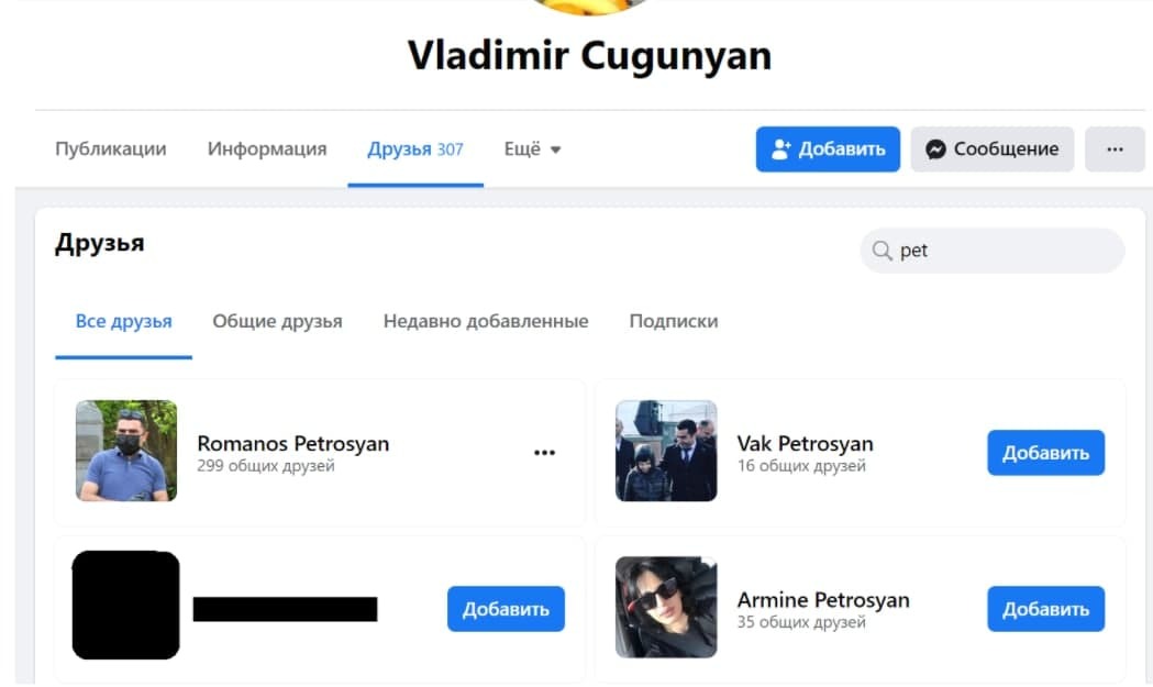 Վլադիմիր Ցուգունյանի ֆեյսբուքյան ընկերների ցանկում են Ռոմանոս Պետրոսյանը, նրա կինը, նրանց որդին, եւ, իհարկե, Պավել Ցուգունյանը։ Եթե Պետրոսյանի՝ Վլադիմիր Ցուգունյանի ընկերներում լինելու հանգամանքը կարող է պայմանավորված լինել նախարարի՝ հանրային դեմք լինելու փաստով, ապա տիկնոջ եւ որդու պարագայում որոշակի կասկած կարող է առաջանալ։