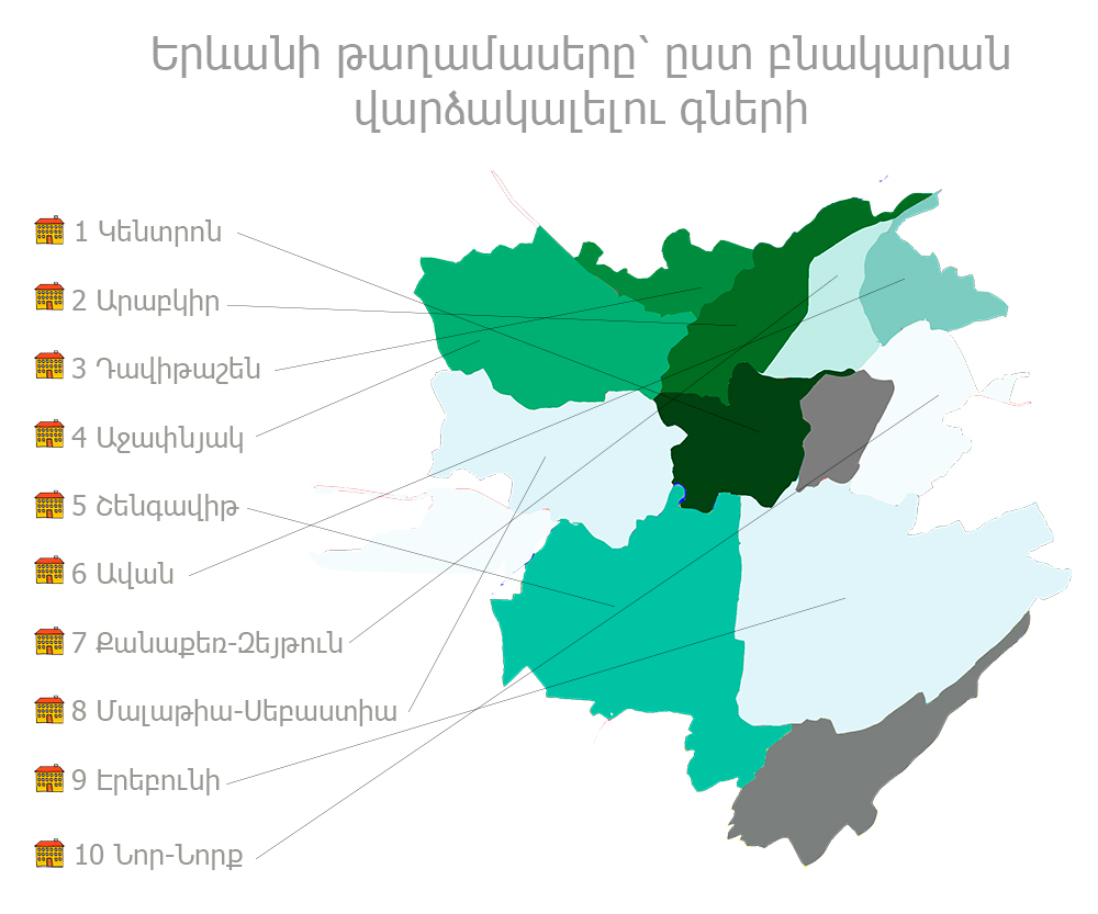Նախ, Երևանի վարչական շրջանների ցուցակը՝ ըստ բնակարան վարձակալելու գների։ Ամենաբարձր գներ ունեցող վարձով բնակարանները Կենտրոն վարչական շրջանում են, որոնց հաջորդում են բնակարանները Արաբկիրում և Դավթաշենում։ Ամենացածր գներով բնակարանները Նոր Նորքում են:
