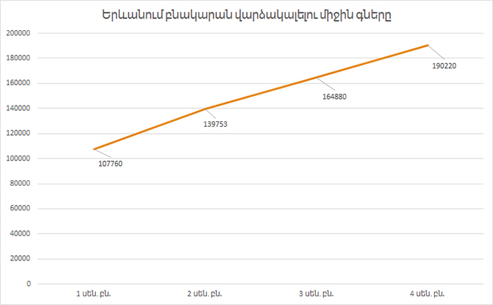 Այսպիսով, Երևանում վարձով բնակարանների միջին գները հետևյալն են։ 1 սենյականոց բնակարանների դեպքում միջին գինը 107 հազար դրամ է (~218$), 2 սենյականոց բնակարաններինը՝ 139 հազար դրամ (~283$), 3 սենյականոց բնակարաններինը՝ 164 հազար դրամ (~334$) և 4 սենյականոց բնակարանների միջին գինը 190 հազար դրամ է (~387$):