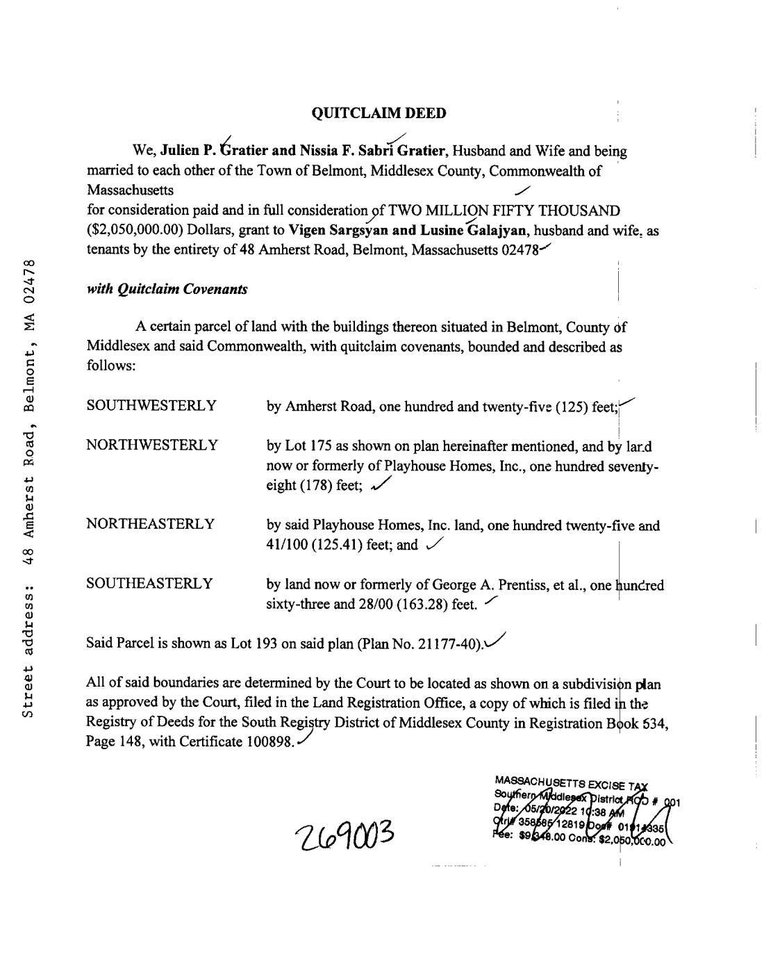 Իսկ Մասաչուսեթսում անշարժ գույքի գործարքների մասին տեղեկություններ պարունակող Banker & Tradesman կազմակերպության կայքից իմանում ենք առանձնատան վաճառքի մասին այլ մանրամասներ։ Այս տարվա հունիսին հրապարակված զեկույցում Banker & Tradesman-ը նշում է, որ Գրատիեր ամուսինները 48 Amherst Road, Belmont, Massachussetts 02478 հասցեում գտնվող առանձնատունը վաճառել են Վիգեն Սարգսյանին և Լուսինե Գալաջյանին (տե՛ս էջ 29)։ Առանձնատան գինն ու վաճառքի ամսաթիվը նույնն են, ինչ վերը նշված կայքերում։